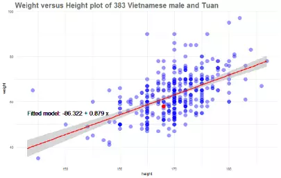 我们的最小二乘线是y = -86.32 + 0.889x,会发现在我这个年龄的越南男性的通常情况是,高1厘米体重就会增加0.88千克。