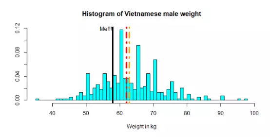 首先画出人口重量直方图,看看我在越南男性中哪个位置。