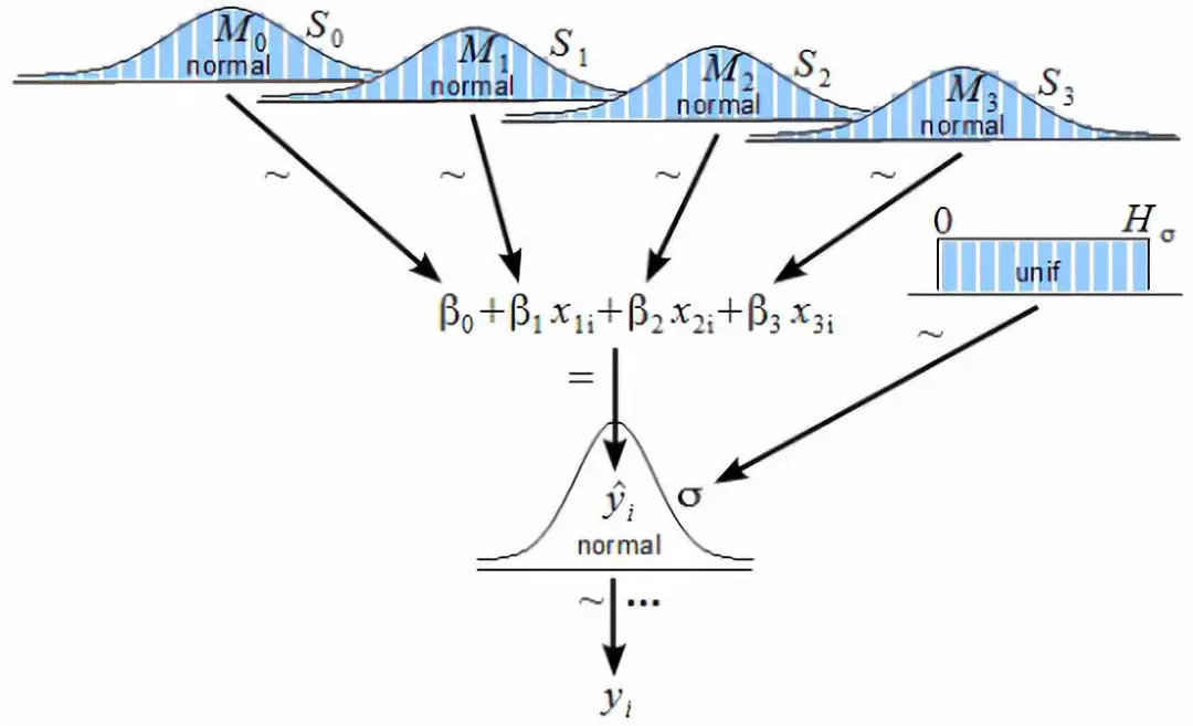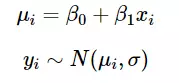总结:因变量 Y 服从满足平均值 μi 和精度参数 τ 的正态分布。 μi 与由 β0 和 β1 参数化的 X 是线性关系
