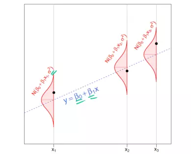 在最标准的线性回归模型中,我们进一步假设给定 X = x下Y的条件分布是正态分布的。这意味着简单的线性回归模型: