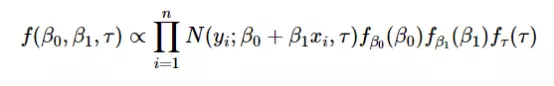 似然函数与上面的相同,但是不同之处在于对待估计参数β0,β1,τ假设了一些先验分布并且将它们包括到了等式中: