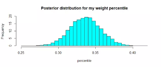 现在,这个图告诉我们的是,我的体重(给定168厘米的身高)最有可能位于越南人口模拟数据的0.3%左右。例如,我们可以找到我的体重在前40个百分点或更少的百分位数。