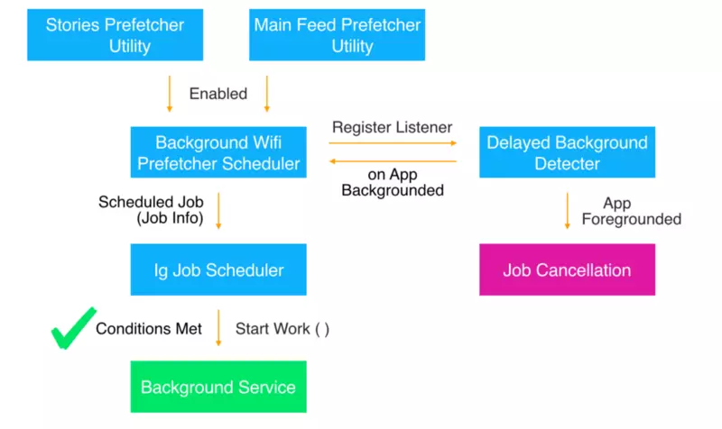 - 当 main activity 启动时(即 app 在前台运行),我们将 BackgroundWifiPrefetcherScheduler 实例化,同时激活即将被运行的一类任务。