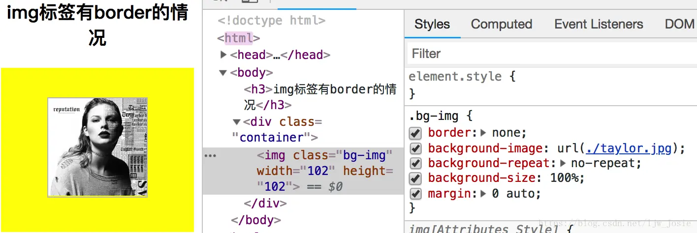 用img标签来设置背景图片,无论你怎么给border加样式都会发现一条摆脱不掉的边框,这是浏览器为了识别img标签自带的一个类似于“占位符”的标记,就是为了告诉这里有张图片。没啥作用。怎么消除这条边框呢?