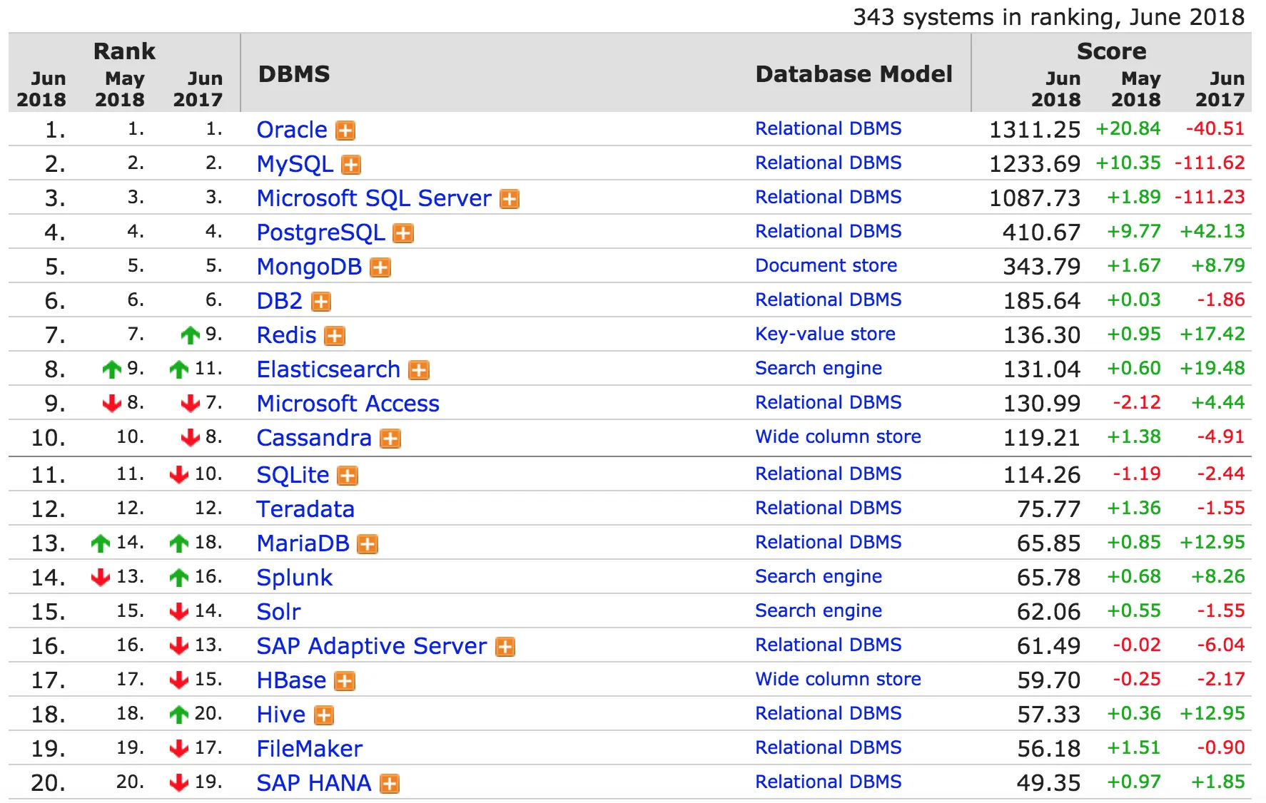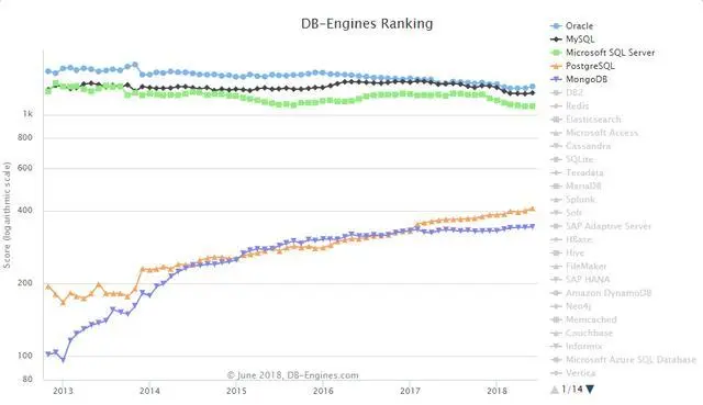 DB-Engines 发布了 2018 年 6 月份的数据库排名: