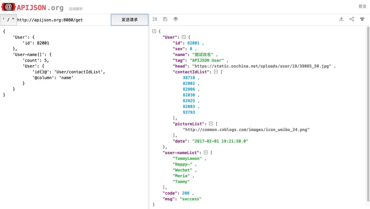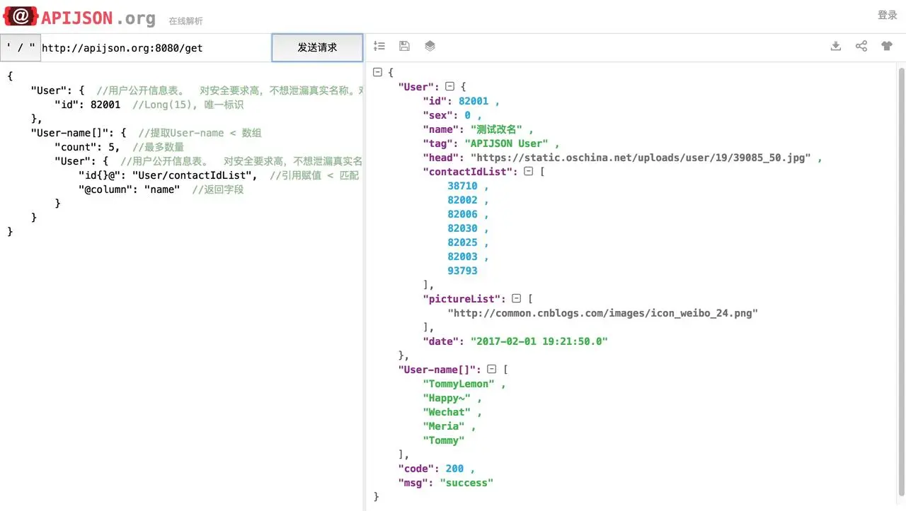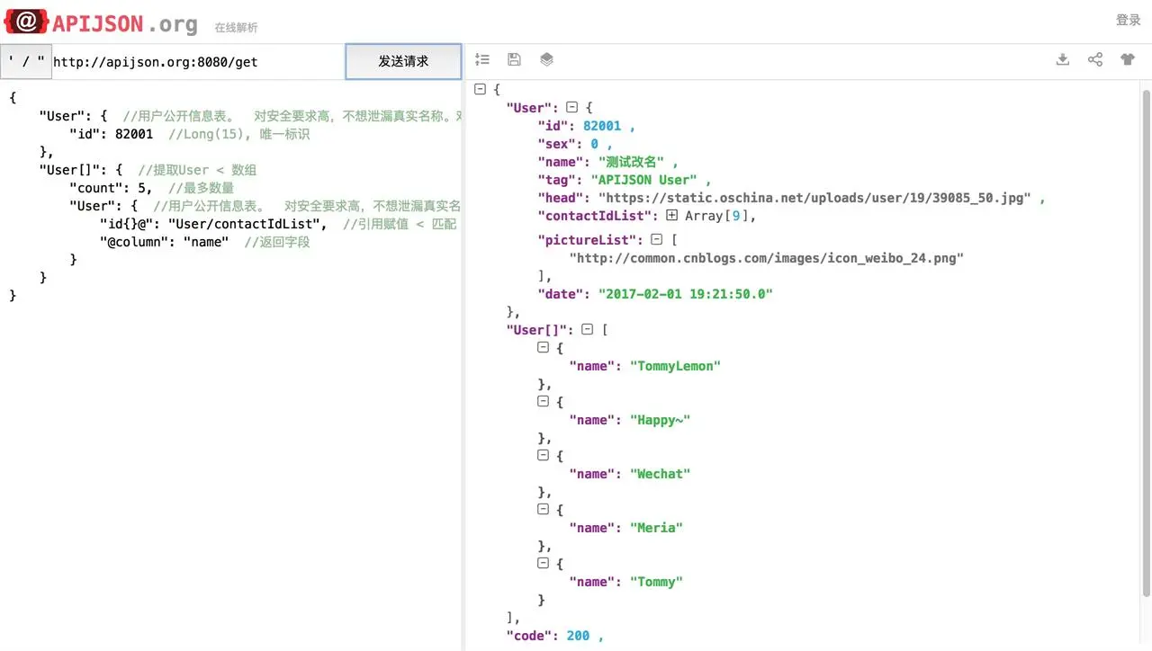 注: 以上APIJSON请求都可以在 apijson.org 在线工具上测试