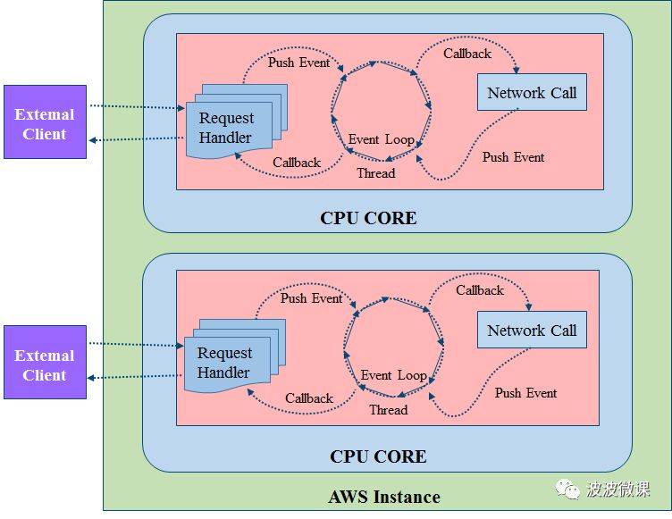 一般异步模式的本质都是使用队列Queue(或称总线Bus),在上图中,你可以简单理解为前端有一个队列专门负责处理用户请求,后端有个队列专门负责处理后台服务调用,中间有个事件环线程(Event Loop Thread),它同时监听前后两个队列上的事件,有事件就触发回调函数处理事件。这种模式下需要的线程比较少,基本上每个CPU核上只需要一个事件环处理线程,前端的连接数可以很多,连接来了只需要进队列,不需要启动线程,事件环线程由事件触发,没有多线程阻塞问题。