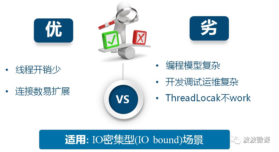 总体上,异步非阻塞模式比较适用于IO密集型(IO bound)场景,这种场景下系统大部分时间在处理IO,CPU计算比较轻,少量事件环线程就能处理。