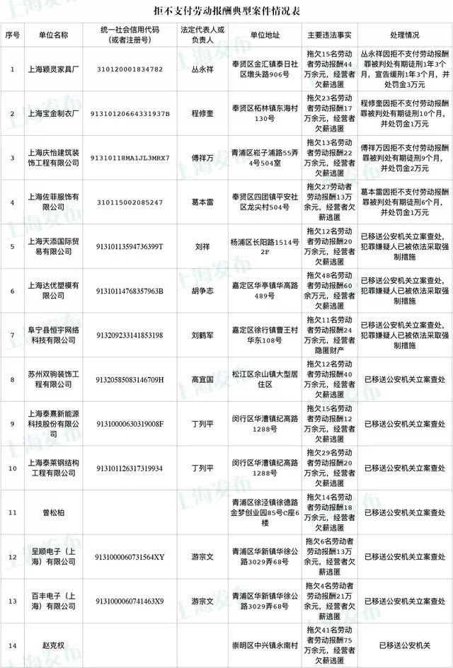 最新消息!市人社局公布了今年1至5月本市涉嫌拒不支付劳动报酬案例,上海颖灵家具厂、上海佐菲服饰有限公司、百丰电子(上海)有限公司等14家单位拒不支付劳动报酬,案件已移送公安机关。详见↓