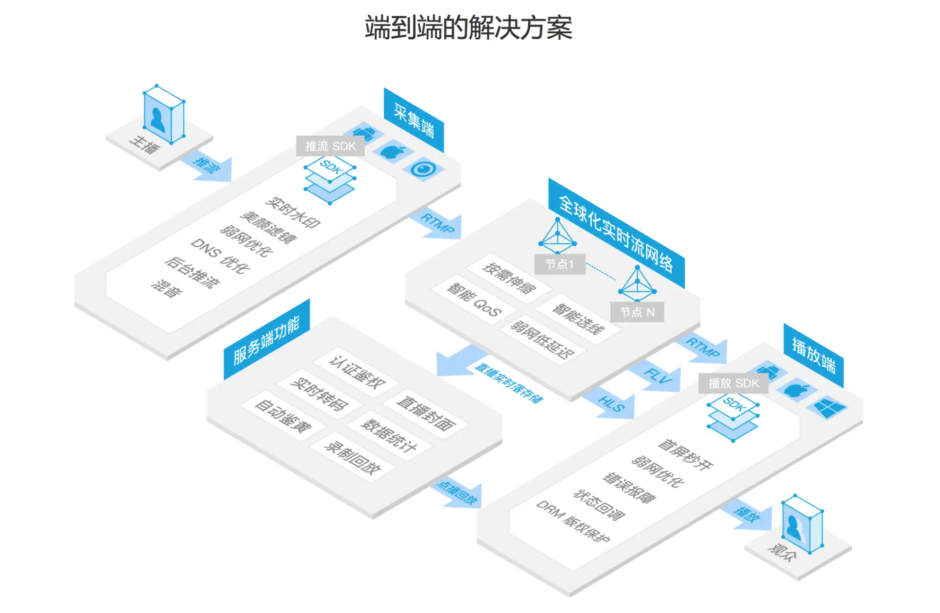 以七牛直播云为例,由于新媒体快速发展,复杂信源对采集端提出了更高的要求,七牛直播云兼容多种采集终端、多种网络环境多机位的直播信源,支持赛事直播、大型秀场直播、大型演唱会直播等多类实时视频流收录。视频流经过多格式转码封装后,依靠全球实时流网络,延迟将降至十毫秒级,给用户带来无滞后感的交互,极大提高用户体验,助力企业在新媒体行业中抢占先机,夺得头筹。