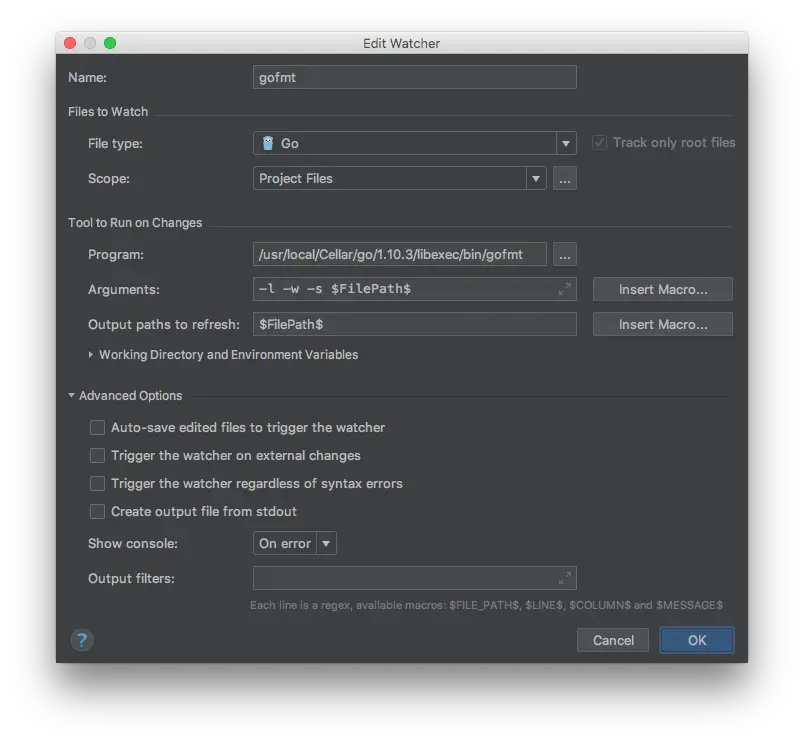 在Goland中,可以通过添加一个File Watcher来在文件发生变化的时候调用gofmt进行代码格式化,具体方法是,点击Preferences -> Tools -> File Watchers,点加号添加一个go fmt模版,Goland中预置的go fmt模版使用的是go fmt命令,将其替换为gofmt,然后在参数中增加-l -w -s参数,启用代码简化功能。添加配置后,保存源码时,goland就会执行代码格式化了。