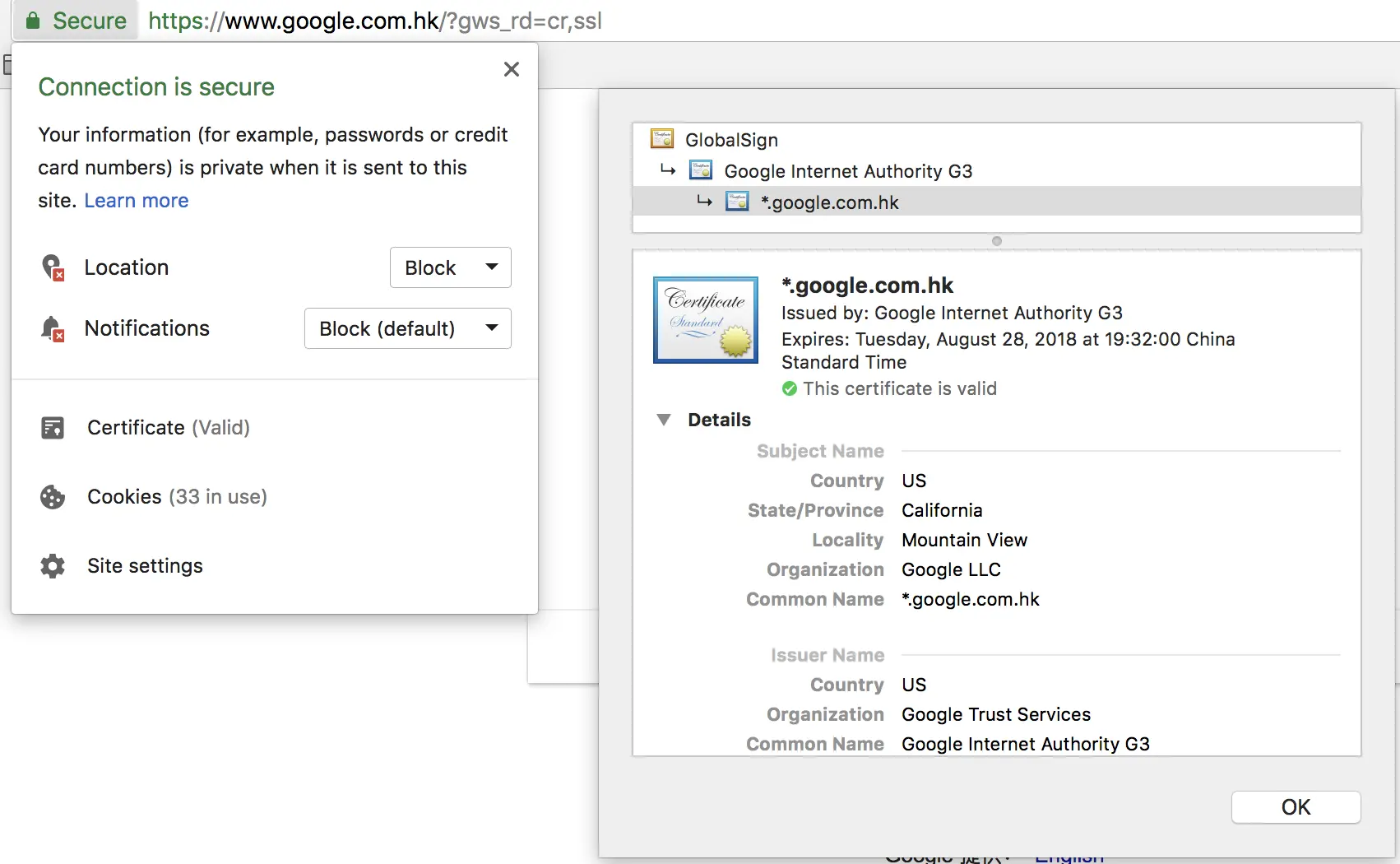 在访问HTTPS的网站中会看到地址栏左侧会有绿色的小锁头,点击打开可以看到这其实是网站的数字证书。