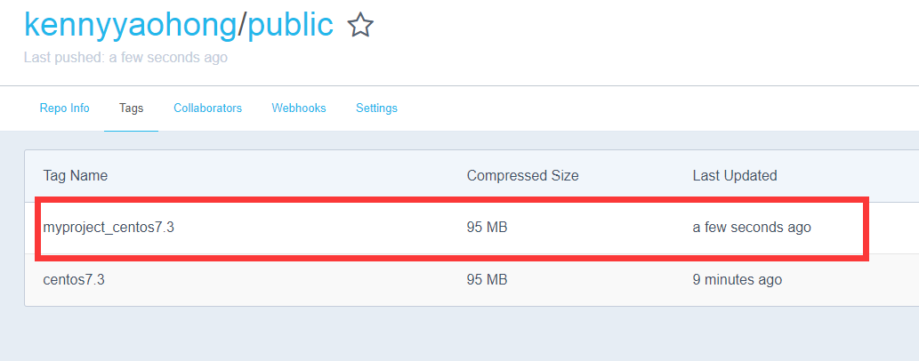》docker tag e12a9ec48ab7 kennyyaohong/public:myproject_centos7.3