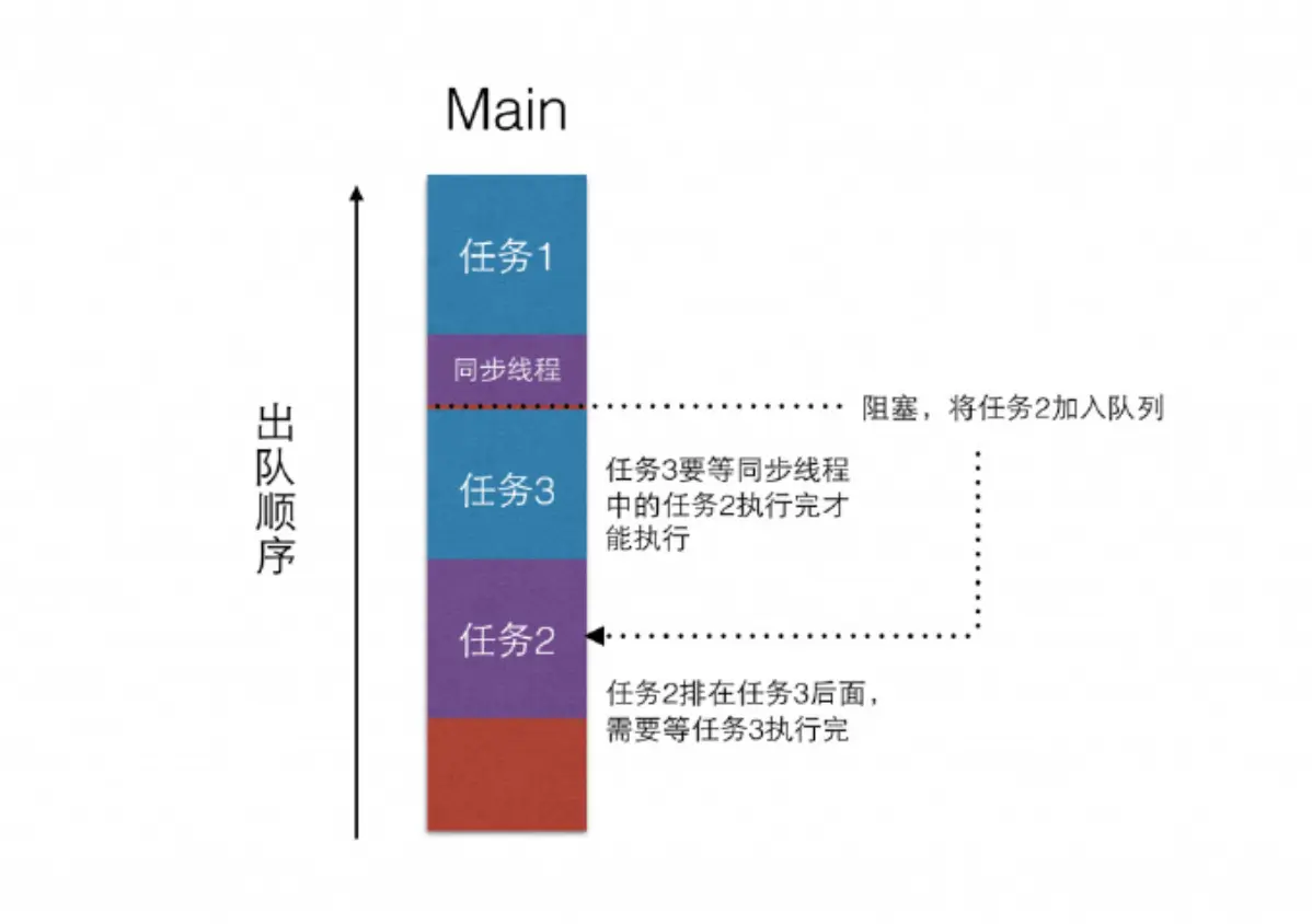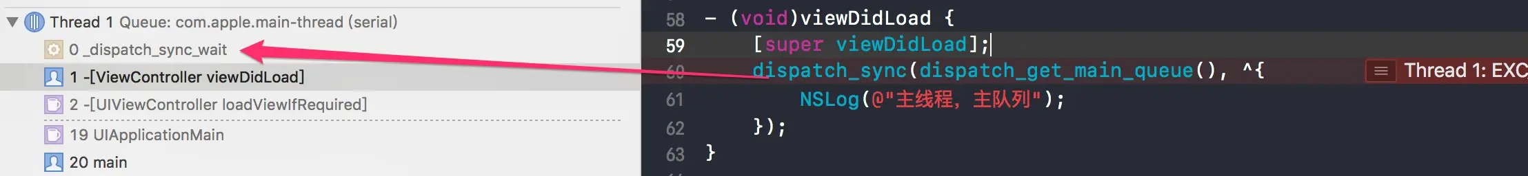 使用dispatch_sync(同步) :dispatch_sync 方法会被加入当前队列,而且dispatch_sync 会等待block执行完毕才return,block被放到指定的queue上面执行,block里的代码执行完(即代码执行到block结束的}),这时候整个dispatch_sync才算执行完。说白了就是dispatch_sync正在出队列,但是要等block执行完才能完全出队列。