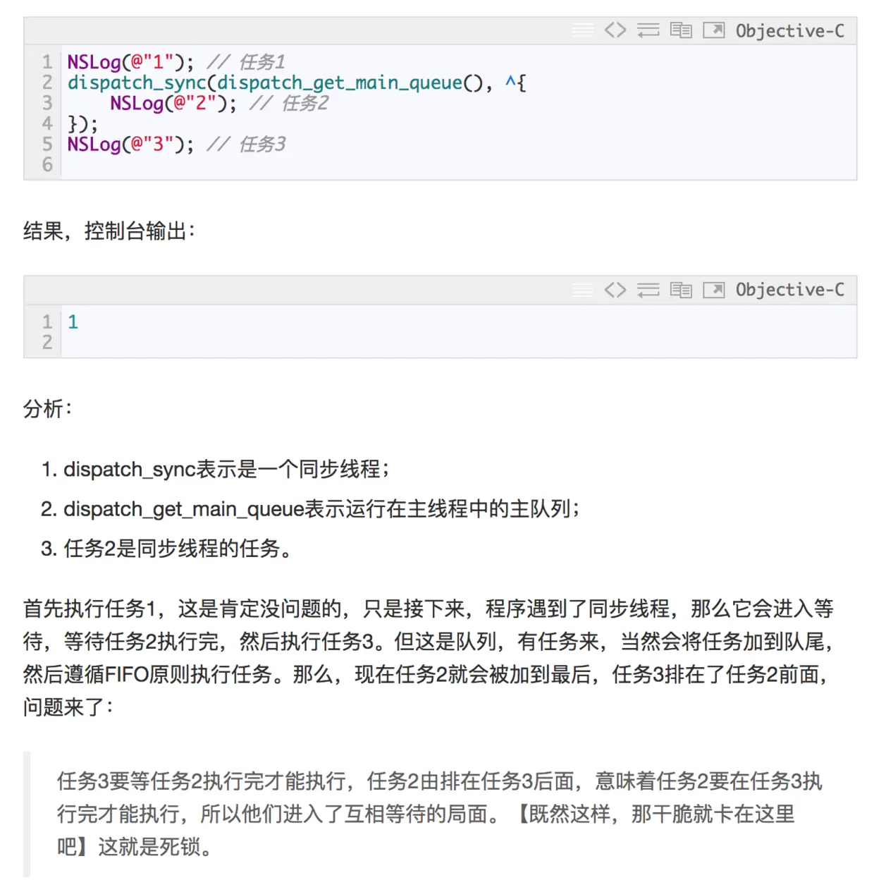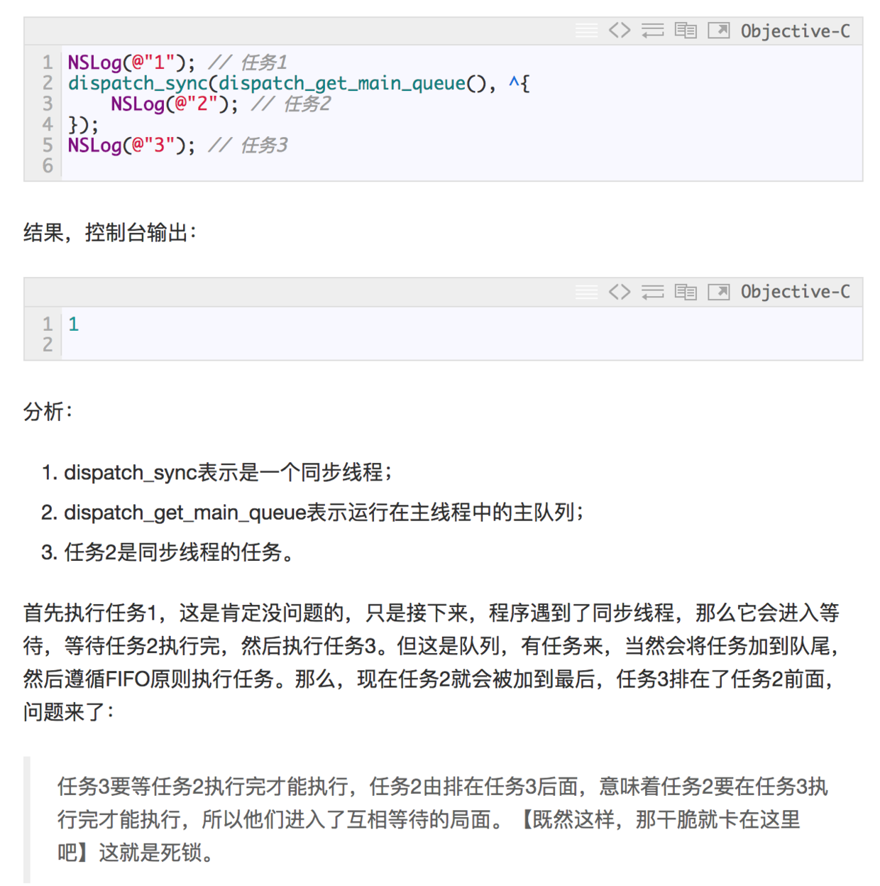 如果死锁的是主线程,那么这个代码也应该死锁,但是这段代码却可以正常的输出,说明主线程没有阻塞。