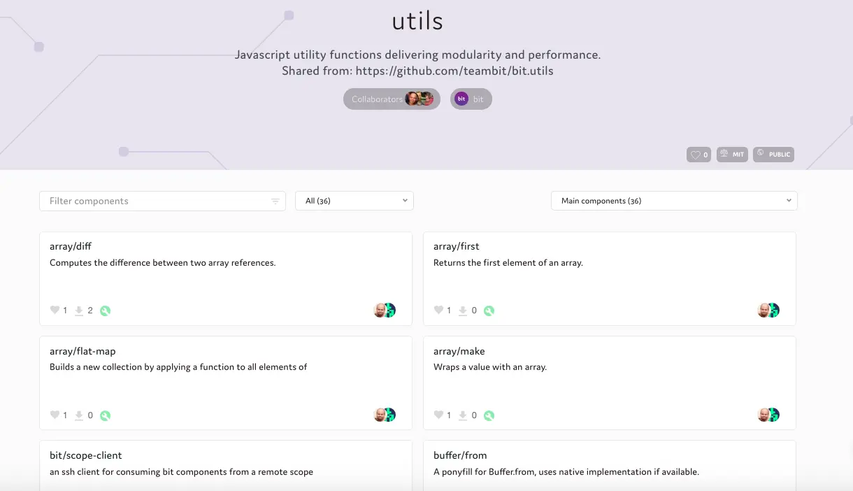 Javascript实用程序功能提供模块化和性能,在Bit的Web中心本身使用。这些功能可以单独使用,可以使用NPM / Yarn进行安装,也可以使用Bit本身从任何使用它们的项目(在任何环境中)进行开发。您可以创建自己的类似集合,并从不同的库和项目中收集有用的功能。