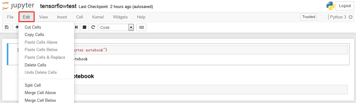 - Edit选项:该选项下为对cell的操作,如删除、剪切、移动等