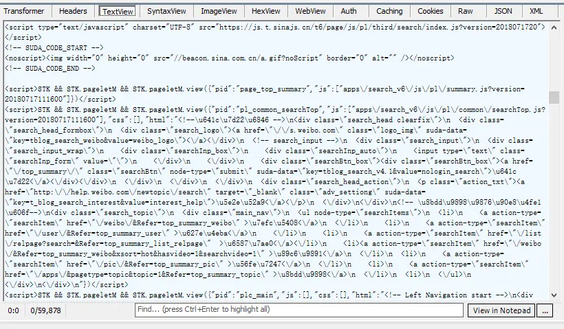 抓包结果 通过fiddler抓包可以看到,这里通过加载js来加载的热搜,而且里面有一段json,这段json就是我们需要的热搜数据(截图不好截图,后面再看吧)。