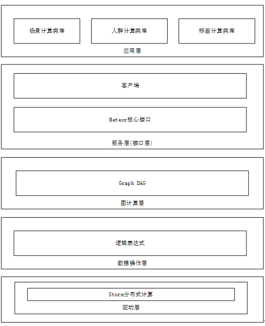 最下层是驱动层。驱动层包括Meteor分别在Storm、Spark等分布式计算系统上的实现,也就是对上层提供了一个统一的接口,使上层只需要处理场景计算等逻辑,而不需要关心在分布式计算系统上的实现过程。