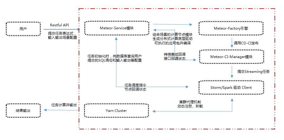 Meteor CI Service模块将编译好的应用包和发布系统进行集成,由发布系统调用底层Storm客户端驱动,自动将应用包发布到Storm。Meteor CI Service和Storm客户端驱动的任务调度通过Meteor Service进行管理。