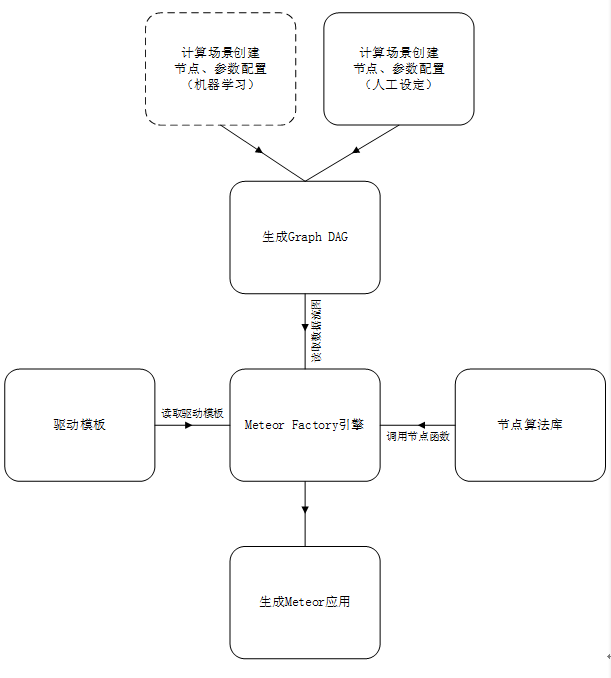 生成后的数据流图注入Meteor Factory进行加工,Meteor Factory是Meteor的应用引擎模块,主要是将组合场景的计算节点模块进行代码集成并编译打包,根据数据流图中配置的计算算法和参数,从节点算法库中调取相应的代码,触发Factory代码生成器,代码生成器根据Storm驱动模板生成相应的代码,生成好的代码执行自动编译并打成Storm可执行的应用包。