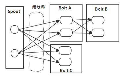 随时市场业务的不断发展,对实时计算的需求也逐渐增大。一直以来,我们根据市场的不同需求定制开发所要计算的Storm应用,Storm实时运行的应用包逻辑上是一个topology,一个Storm的topology相当于MapReduce的一个job,不同是MapReduce的job有明确的起始和结束,而Storm的topology一旦被初始化就会一直运行下去,形成的topology是有spout、bolt通过数据流分组连接起来的图结构。如下: