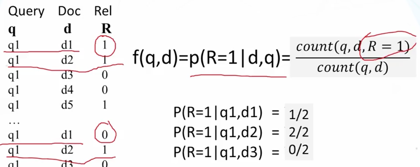 根据现有搜集的数据做估算,假设一个文档被用户看到了,如果文档被用户点击进去,那么认为是相关的,否则不相关[只认为相关和不相关],那么在特定的查询情况下,便可得到这种点击比例。