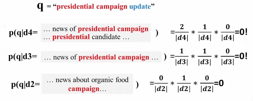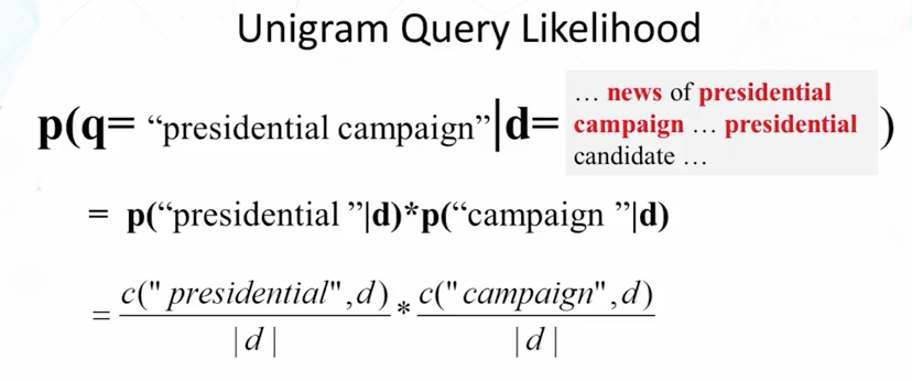 给定一个查询,根据Unigram LM的规则,它可以被拆分成单个单词的概率乘积