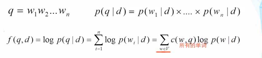 可以看出这样计算也存在问题,它是根据文档中包含查询语句的方式来计算的;反过来想,用户的所有可能输入当做一个文档库,那么他也会有一个相对的排序,所以也会出现一个单词排列,而这些排列中的单词很有可能不在需要查询到文档库中。因此为解决这些问题,可以在计算概率上加上log运算函数,改成加法便能得到解决