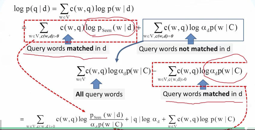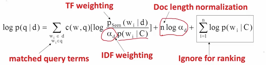 函数重写后,对于排序来讲,最后一部分,所有的文档算出来的值都是一样,所以可以忽略【针对所有的文档库计算的】,对于中间的部分,可以看到相对长的查询有一个基于因子的log算法,某种程度上是对长度的一种惩罚,越长可以选择较大的因子,而对于第一部分来讲,可以看到,可见的文档的单词概率则类似于TF,不可见的文档部分则相当于IDF的作用[在非当前文档中出现的概率越大,作用反而越小]