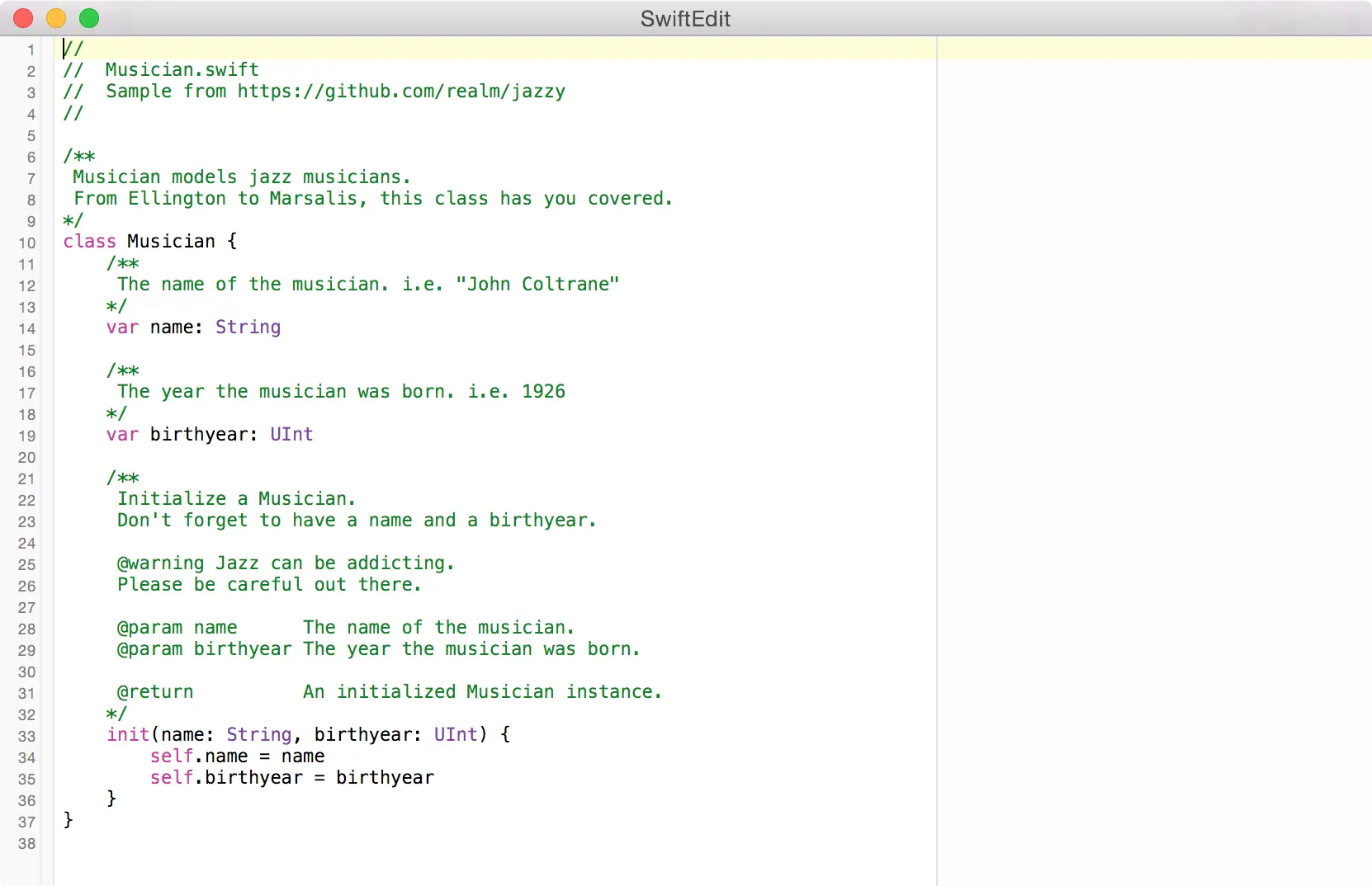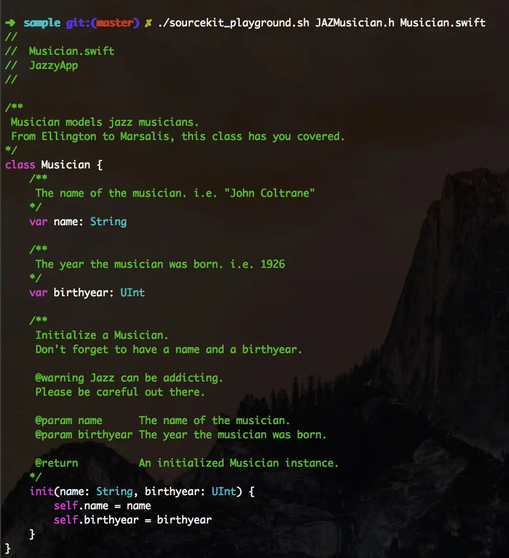 jazzy 是一个命令行工具,可以为你的 Swift 或 Obj-C 项目生成文档。其利用 SourceKit 以获得从 Obj-C 定义令牌(例如类,属性,方法等)的 Swift 语法。