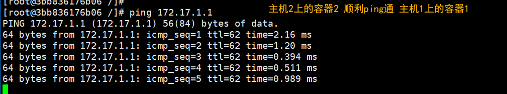 好了,现在两容器可以互ping了