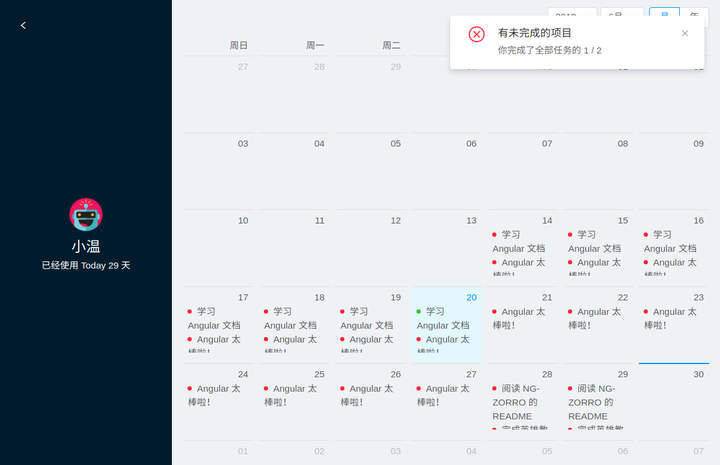 - 帮助用户记录他们每一天完成任务的情况,并且通过日历的形式进行展示