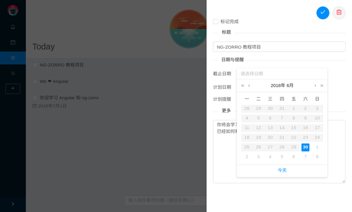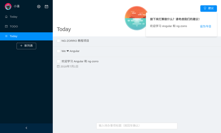 - Angular 实战教程 - 手把手教你构建待办事项应用 Today (Part 1):项目简介,学习在项目中添加 NG-ZORRO,编写最简单的 setup(初始设置)界面