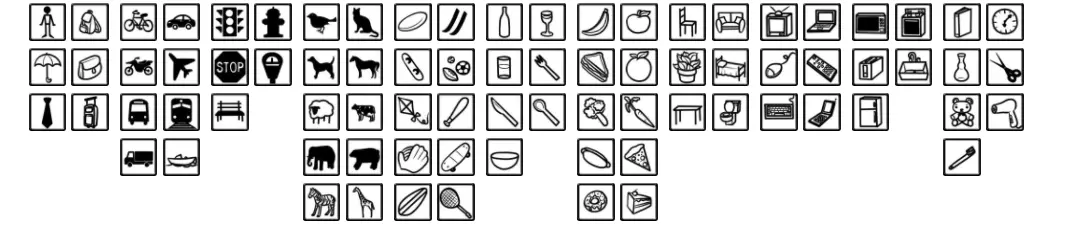 Object Detection API提供了预训练的物体检测模型,这些模型都是由COCO数据集训练而成。COCO数据集包含了90种常见物体,下面展示的是COCO数据集中部分物体的图像: