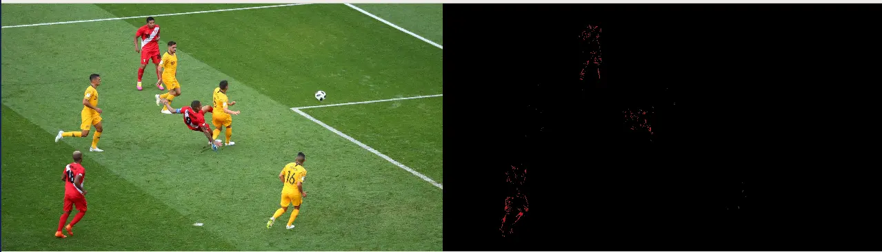 OpenCV能让我们识别出特定颜色的掩膜(mask),可以用这点识别出红颜色和黄颜色的球员。下面是OpenCV掩膜检测图像中红颜色的工作示例: