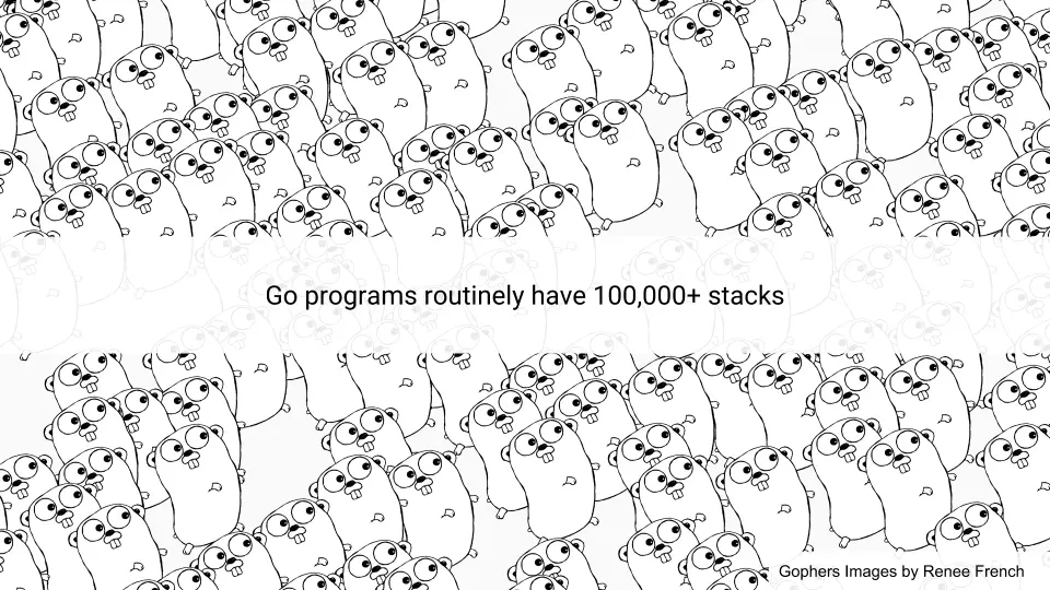Well first of all Go programs have hundreds of thousands of stacks. They are managed by the Go scheduler and are always preempted at GC safepoints. The Go scheduler multiplexes Go routines onto OS threads which hopefully run with one OS thread per HW thread. We manage the stacks and their size by copying them and updating pointers in the stack. It's a local operation so it scales fairly well.