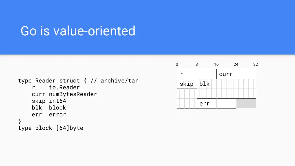 The next thing that is important is the fact that Go is a value-oriented language in the tradition of C-like systems languages rather than reference-oriented language in the tradition of most managed runtime languages. For example, this shows how a type from the tar package is laid out in memory. All of the fields are embedded directly in the Reader value. This gives programmers more control over memory layout when they need it. One can collocate fields that have related values which helps with cache locality.
