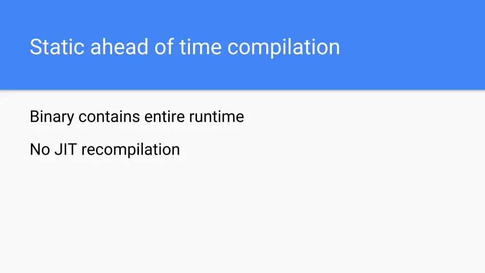 We also have a way ahead of time compilation system so the binary contains the entire runtime.