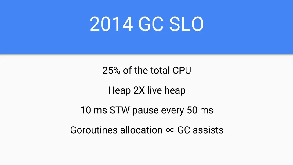 But short term 2014 we had to get our act together. We had to convert all of the runtime and compiler to Go. They were written in C at the time. No more C, no long tail of bugs due to C coders not understanding GC but having a cool idea about how to copy strings. We also needed something quickly and focused on latency but the performance hit had to be less than the speedups provided by the compiler. So we were limited. We had basically a year of compiler performance improvements that we could eat up by making the GC concurrent. But that was it. We couldn't slow down Go programs. That would have been untenable in 2014.