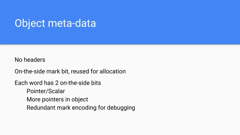 The next design choice was where to put the object's metadata. We needed to have some information about the objects since we didn't have headers. Mark bits are kept on the side and used for marking as well as allocation. Each word has 2 bits associated with it to tell you if it was a scalar or a pointer inside that word. It also encoded whether there were more pointers in the object so we could stop scanning objects sooner than later. We also had an extra bit encoding that we could use as an extra mark bit or to do other debugging things. This was really valuable for getting this stuff running and finding bugs.