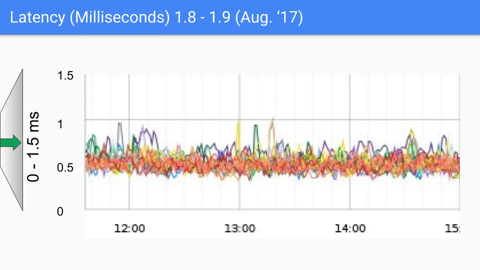 The next release was in March of 2017. We had the last of our large latency drops which was due to figuring out how to avoid the stop the world stack scanning at the end of the GC cycle. That dropped us into the sub-millisecond range. Again the Y axis is about to change to 1.5 milliseconds and we see our third order of magnitude improvement.