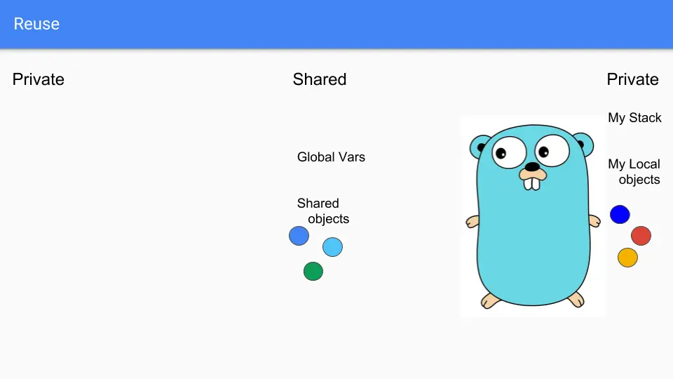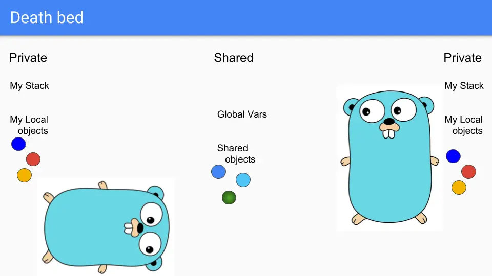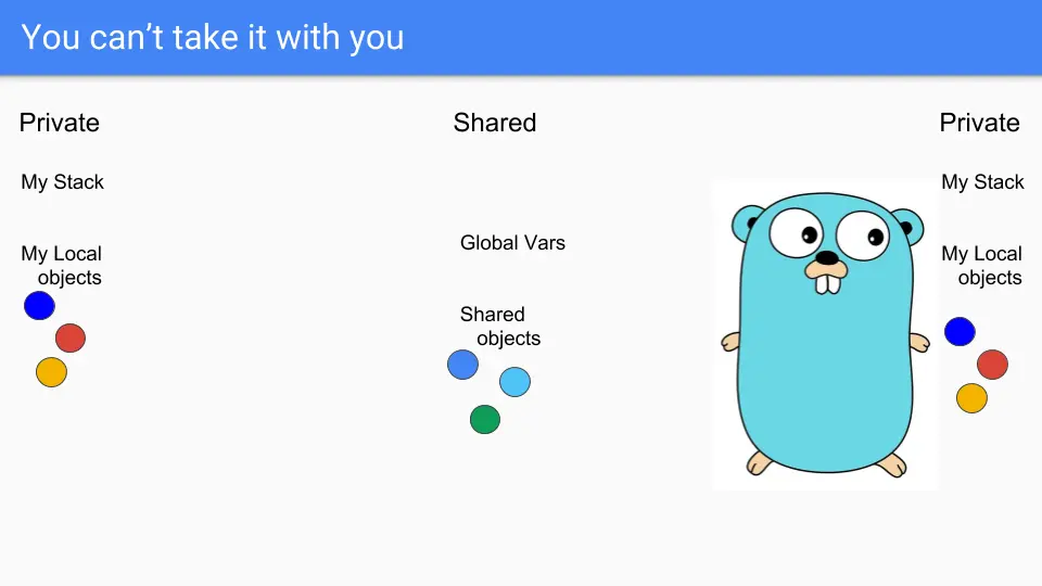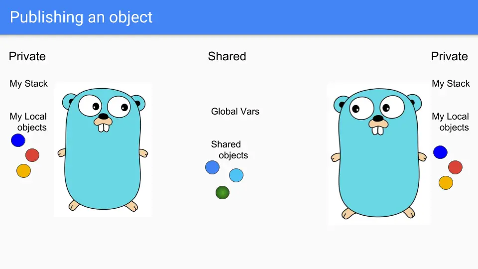 Goroutines are lightweight threads that look like Gophers, so here we have two Goroutines. They share some stuff such as the two blue objects there in the middle. They have their own private stacks and their own selection of private objects. Say the guy on the left wants to share the green object.