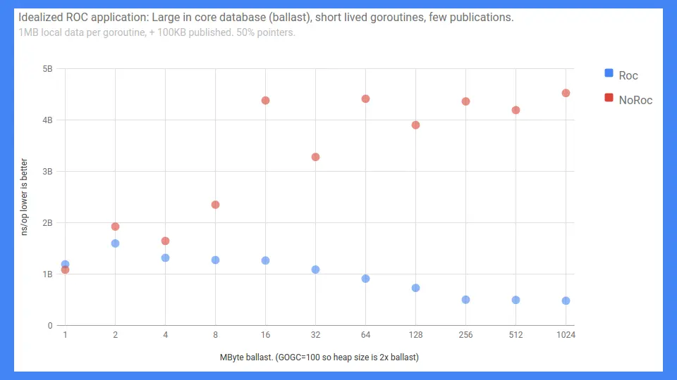 It's true we scaled but we only had 4 to 12 hardware thread system so we couldn't overcome the write barrier tax. Perhaps in the future when we have 128 core systems and Go is taking advantage of them, the scaling properties of ROC might be a win. When that happens we might come back and revisit this, but for now ROC was a losing proposition.