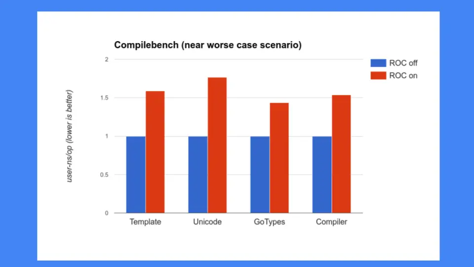But that wasn't good enough, we also had to make sure that ROC didn't slow down other pieces of the system. At that point there was a lot of concern about our compiler and we could not slow down our compilers. Unfortunately the compilers were exactly the programs that ROC did not do well at. We were seeing 30, 40, 50% and more slowdowns and that was unacceptable. Go is proud of how fast its compiler is so we couldn't slow the compiler down, certainly not this much.