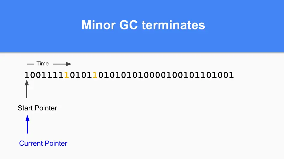 You continue until at some point it is time to do a generation GC. You will notice that if there is a one in the mark/allocation vector then that object was alive at the last GC so it is mature. If it is zero and you reach it then you know it is young.