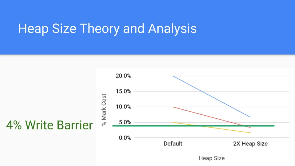 Let's look at this graph. It's just an analytical graph of mark costs. Each line represents a different application that might have a mark cost. Say your mark cost is 20%, which is pretty high but it's possible. The red line is 10%, which is still high. The lower line is 5% which is about what a write barrier costs these days. So what happens if you double the heap size? That's the point on the right. The cumulative cost of the mark phase drops considerably since GC cycles are less frequent. The write barrier costs are constant so the cost of increasing the heap size will drive that marking cost underneath the cost of the write barrier.