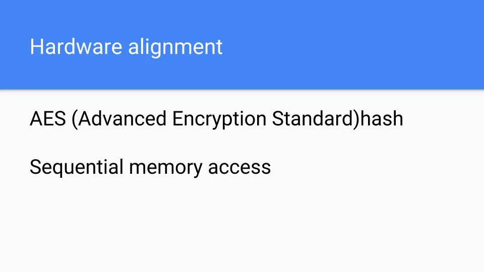 Today's modern architectures have AES (Advanced Encryption Standard) instructions. One of those instructions can do encryption-grade hashing and with encryption-grade hashing we don't have to worry about collisions if we also follow standard encryption policies. So hashing is not going to cost us much but we have to load up what we are going to hash. Fortunately we are walking through memory sequentially so we get really good memory and cache performance. If you have a DIMM and you hit sequential addresses, then it's a win because they will be faster than hitting random addresses. The hardware prefetchers will kick in and that will also help. Anyway we have 50 years, 60 years of designing hardware to run Fortran, to run C, and to run the SPECint benchmarks. It's no surprise that the result is hardware that runs this kind of stuff fast.