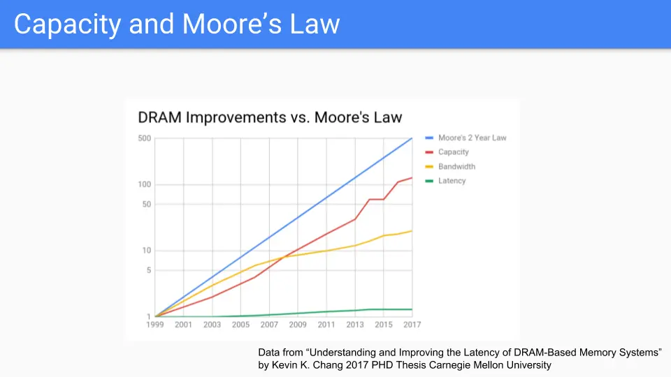 (Data from "Understanding and Improving the Latency of DRAM-Based Memory Systems Submitted in partial fulfillment of the requirements for the degree of Doctor of Philosophy in Electrical and Computer Engineering Kevin K. Chang M.S., Electrical & Computer Engineering, Carnegie Mellon University B.S., Electrical & Computer Engineering, Carnegie Mellon University Carnegie Mellon University Pittsburgh, PA May, 2017". See Kevin K. Chang's thesis. The original graph in the introduction was not in a form that I could draw a Moore's law line on it easily so I changed the X-axis to be more uniform.)
