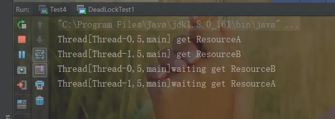 从输出结果可以知道线程调度器先调度了线程 A,也就是把 CPU 资源让给了线程 A,线程 A 调用了 getResourceA() 方法,方法里面使用 synchronized(resourceA) 方法获取到了 resourceA 的监视器锁,然后调用 sleep 函数休眠 1s,休眠 1s 是为了保证线程 A 在执行 getResourceB 方法前让线程 B 抢占到 CPU 执行 getResourceB 方法。
